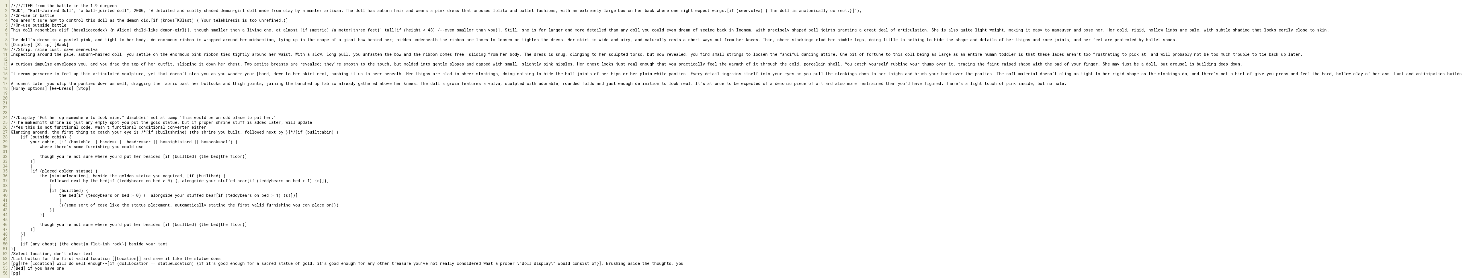 "BJD", "Ball-Jointed Doll", "a ball-jointed doll", 2000, "A detailed and subtly shaded demon-girl doll made from clay by a master artisan. The doll has auburn hair and wears a pink dress that crosses lolita and ballet fashions, with an extremely large bow on her back where one might expect wings.[if (seenvulva) { The doll is anatomically correct.}]");