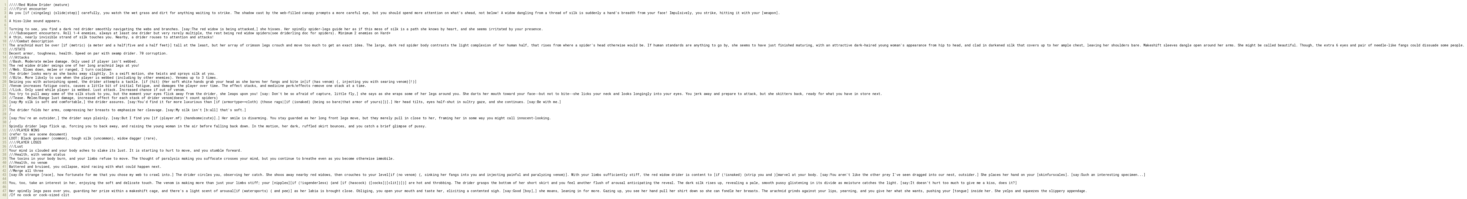 [say:Oh strange [race], how fortunate for me that you chose my web to crawl into.] The drider circles you, observing her catch. She shoos away nearby red widows, then crouches to your level[if (no venom) {, sinking her fangs into you and injecting painful and paralyzing venom}]. With your limbs sufficiently stiff, the red widow drider is content to [if (!isnaked) {strip you and }]marvel at your body. [say:You aren't like the other prey I've seen dragged into our nest, outsider.] She places her hand on your [skinfurscales]. [say:Such an interesting specimen...]