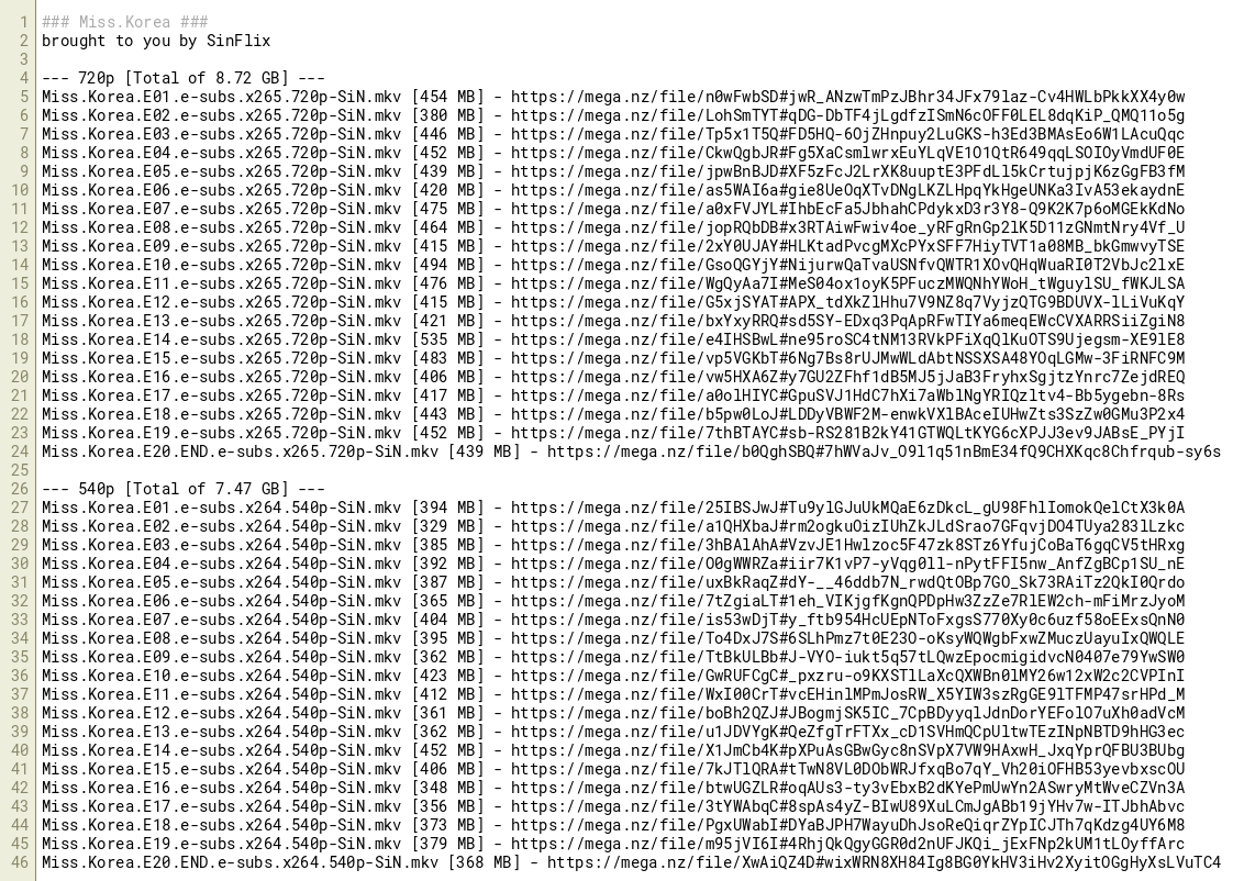Miss.Korea.E20.END.e-subs.x264.540p-SiN.mkv [368 MB] - https://mega.nz/file/XwAiQZ4D#wixWRN8XH84Ig8BG0YkHV3iHv2XyitOGgHyXsLVuTC4