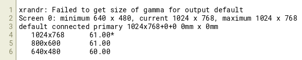 xrandr: Failed to get size of gamma for output default Screen 0: minimum 640 x 480, current 1024 x 768, maximum 1024 x 768 default connected primary 1024x768+0+0 0mm x 0mm 1024x768 61.00* 800x600 61.00 640x480 60.00