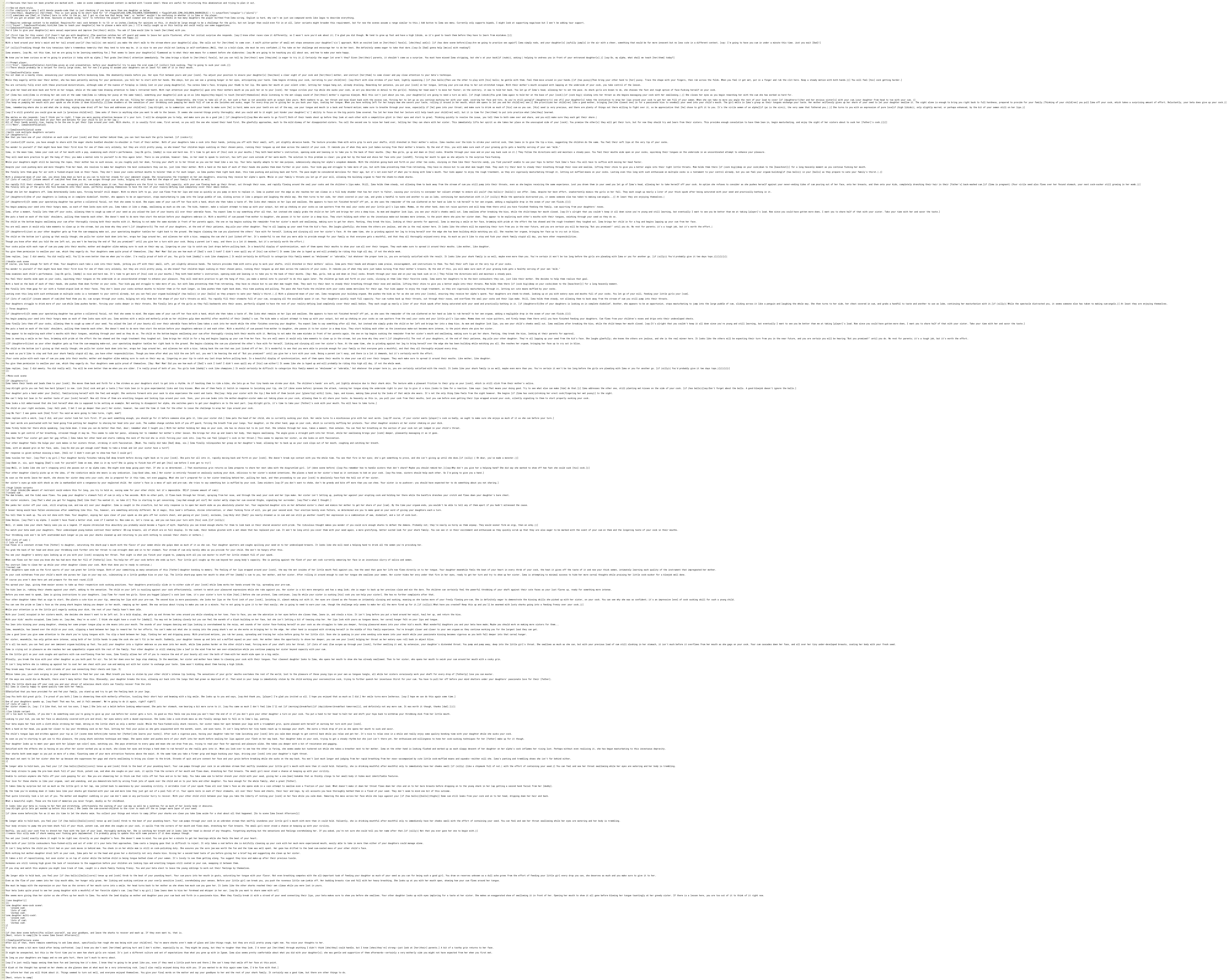 All of their hands quickly rise, hoping to be the one to get their lips around your cock. With sharks, it is usually first come, first served, so you call the one who raised their hand first. She gleefully approaches, much to the mild dismay of her disappointed sisters. You call the second one to raise her hand over, telling her they can share with her sister. This immediately lifts her spirit as she takes her place on the unoccupied side of your [cock]. You promise the other[s] they will get their turn, but for now they should try and learn from their sisters. This provides enough consolation to have them lean in, begin masturbating, and enjoy the sight of her sisters about to suck her [father]'s cock.}]}]]