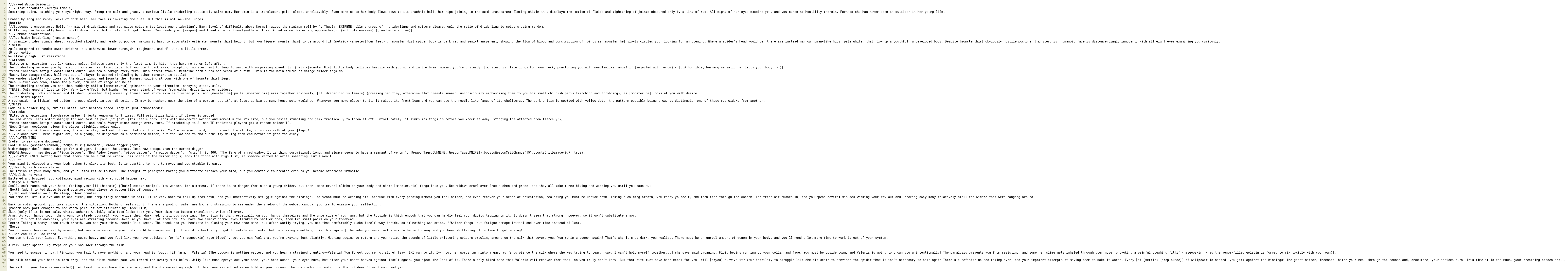 Skittering can be quietly heard in all directions, but it starts to get closer. You ready your [weapon] and tread more cautiously--there it is! A red widow driderling approaches[if (multiple enemies) {, and more in tow}]!