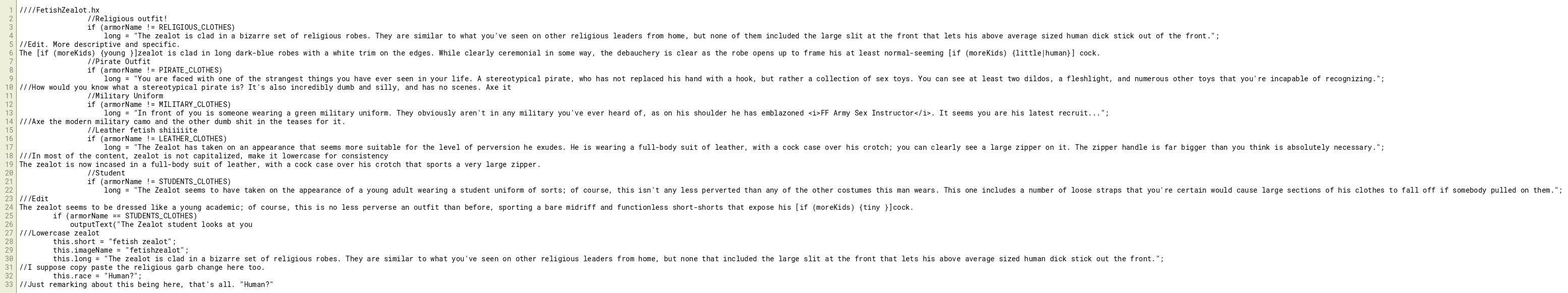 this.long = "The zealot is clad in a bizarre set of religious robes. They are similar to what you've seen on other religious leaders from home, but none that included the large slit at the front that lets his above average sized human dick stick out the front.";