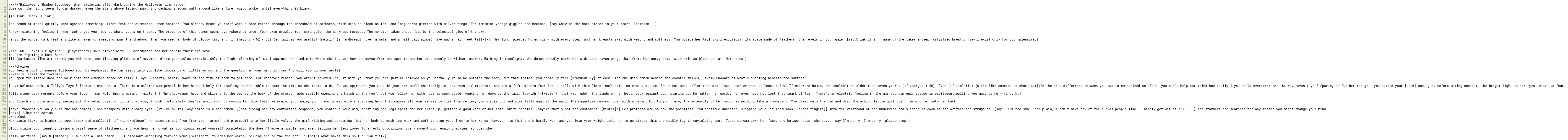 [if (darkness) {The air around you whispers, and fleeting glimpses of movement drive your pulse erratic. Only the light clinking of metal against horn indicate where she is, yet how she moves from one spot to another so suddenly is without answer.|Bathing in moonlight, the demon proudly shows her wide-span raven wings that frame her curvy body, with skin as black as tar. Her horns }]