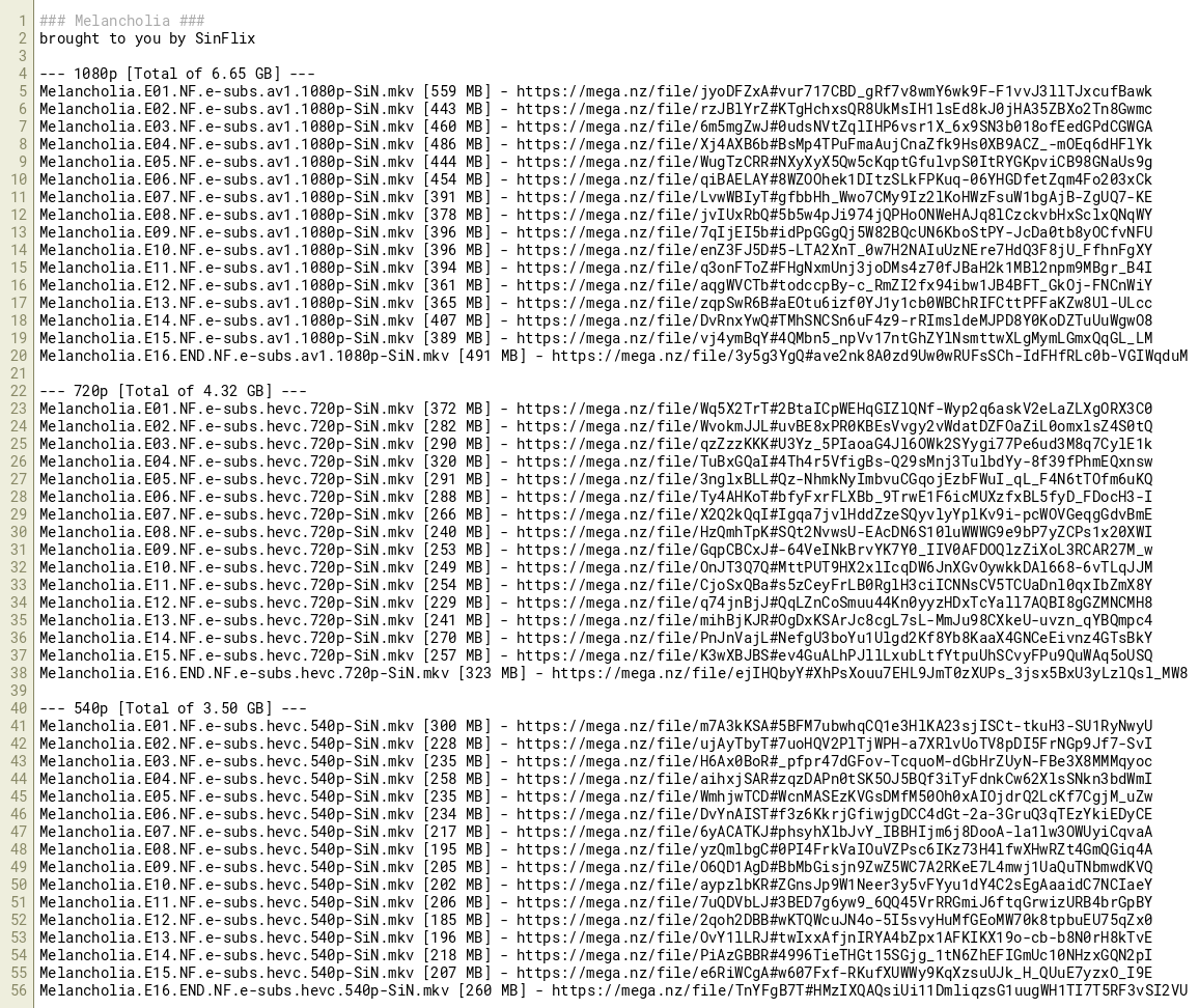 Melancholia.E08.NF.e-subs.hevc.540p-SiN.mkv [195 MB] - https://mega.nz/file/yzQmlbgC#0PI4FrkVaIOuVZPsc6IKz73H4lfwXHwRZt4GmQGiq4A