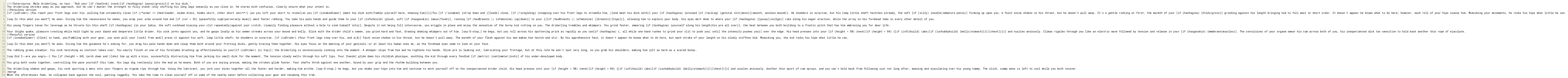 [if (isDrider) {You reach your front legs over his, pulling him intimately close [if (/*armor == cheerleader, widow dress, bimbo skirt, other short skirt*/) {as you lift your skirt to reveal|as you [if (isnakedlower) {meet his dick with|fumble yourself bare, showing him}]}]|You [if (!isnaked) {strip down and }][walk] close, [if (!singleleg) {stepping over his front legs to straddle him, }]and meet his dick with}] your [if (hasVagina) {aroused [if (tailLeg) {genital slit|mons}]|smooth, sexless mound}]. He shudders in surprise, but his limp little shaft twitches already, the soft [if (silly) {noodle|immature penis}] firming up upon you. A faint noise chokes in his throat, but he doesn't pull away. It's a gentle rocking at first, the warmth of your [if (hasVagina) {folds|groin}] grinding against his length bringing him to full mast in short order. It doesn't appear he knows what to do here; however, each roll of your hips coaxes him. Mimicking your movements, he rocks his hips what little he can.
