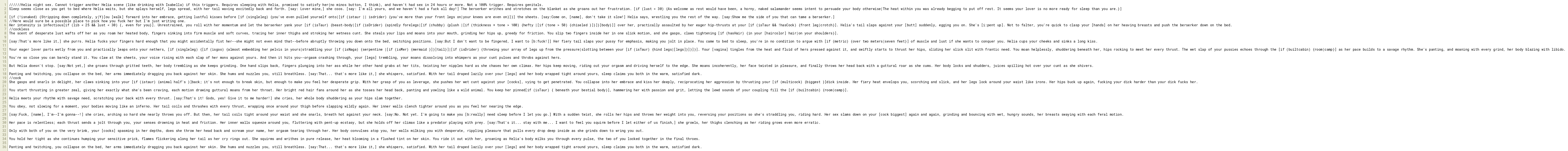 //////Helia night sex. Cannot trigger another Helia scene (like drinking with Isabella) if this triggers. Requires sleeping with Helia, promised to satisfy her(no minos button, I think), and haven't had sex in 24 hours or more. Not a 100% trigger. Requires genitals.