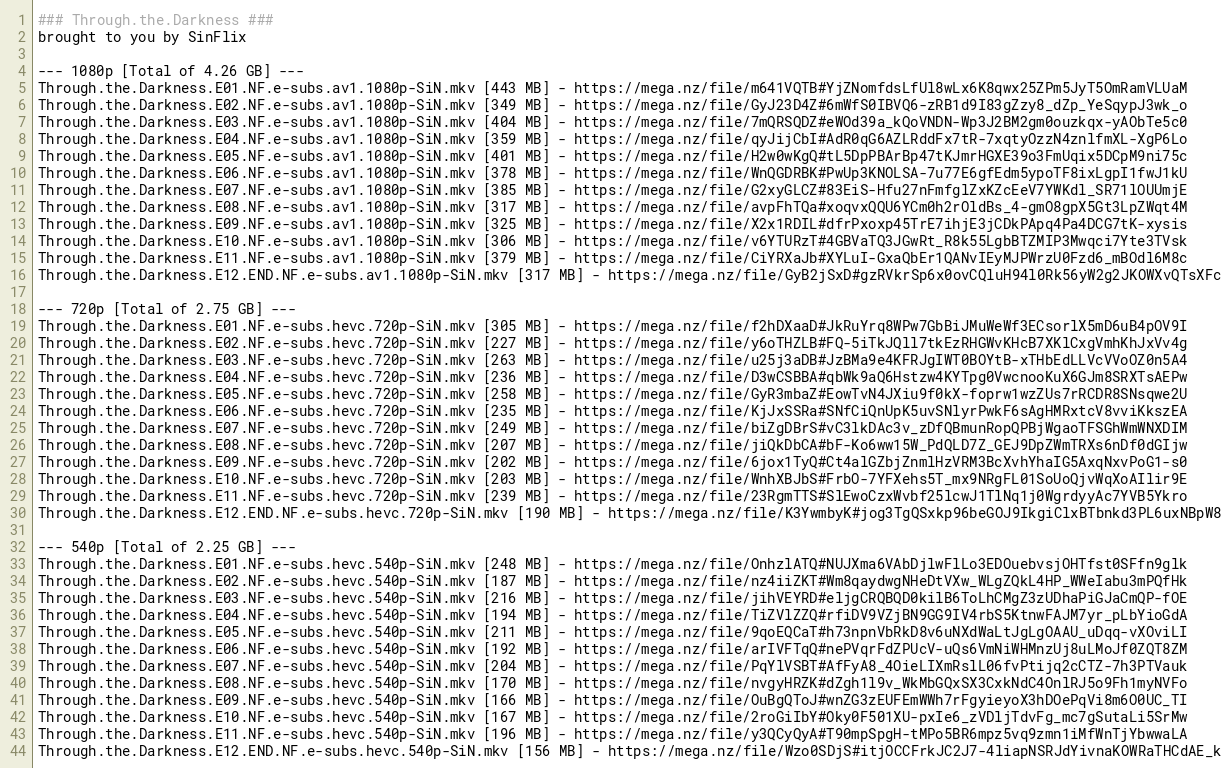 Through.the.Darkness.E06.NF.e-subs.av1.1080p-SiN.mkv [378 MB] - https://mega.nz/file/WnQGDRBK#PwUp3KNOLSA-7u77E6gfEdm5ypoTF8ixLgpI1fwJ1kU