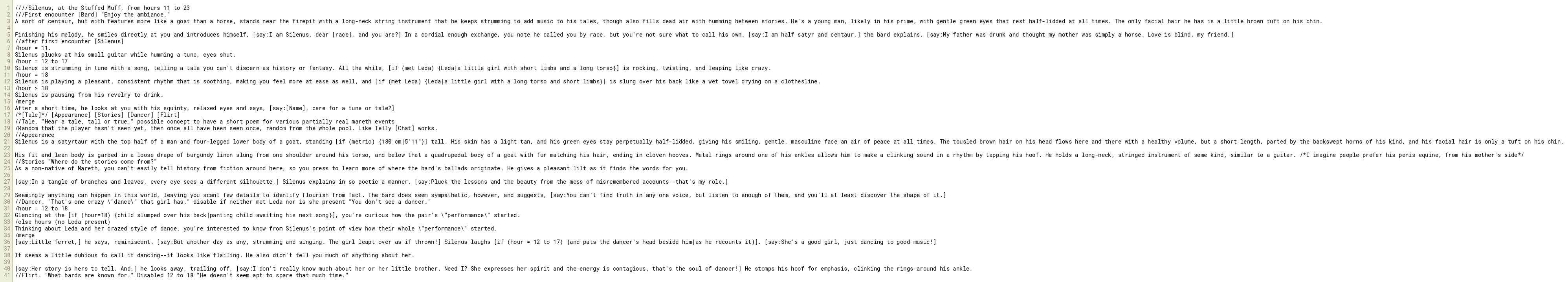 [say:Little ferret,] he says, reminiscent. [say:But another day as any, strumming and singing. The girl leapt over as if thrown!] Silenus laughs [if (hour = 12 to 17) {and pats the dancer's head beside him|as he recounts it}]. [say:She's a good girl, just dancing to good music!]