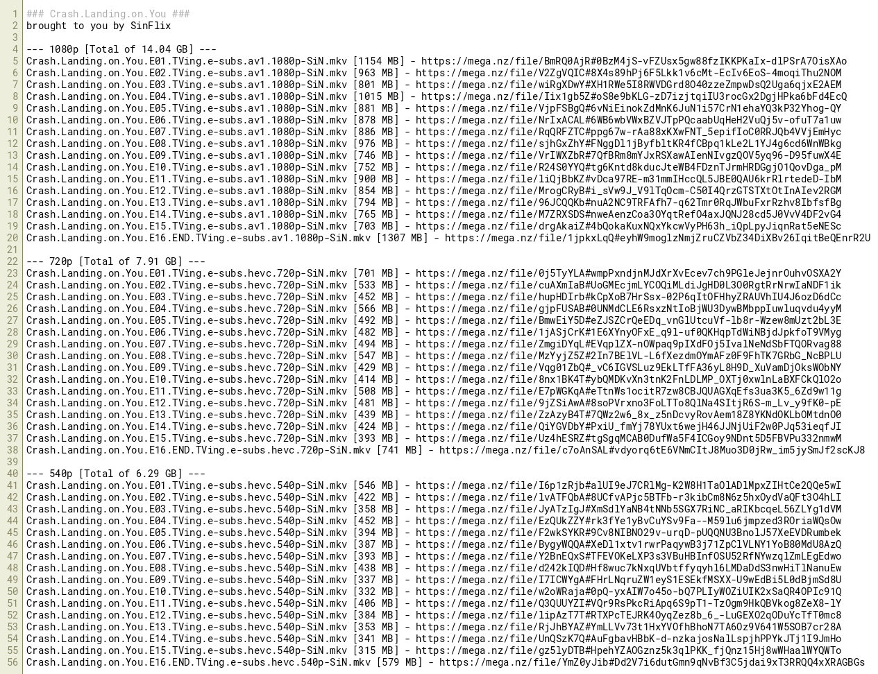Crash.Landing.on.You.E16.END.TVing.e-subs.hevc.720p-SiN.mkv [741 MB] - https://mega.nz/file/c7oAnSAL#vdyorq6tE6VNmCItJ8Muo3D0jRw_im5jySmJf2scKJ8
