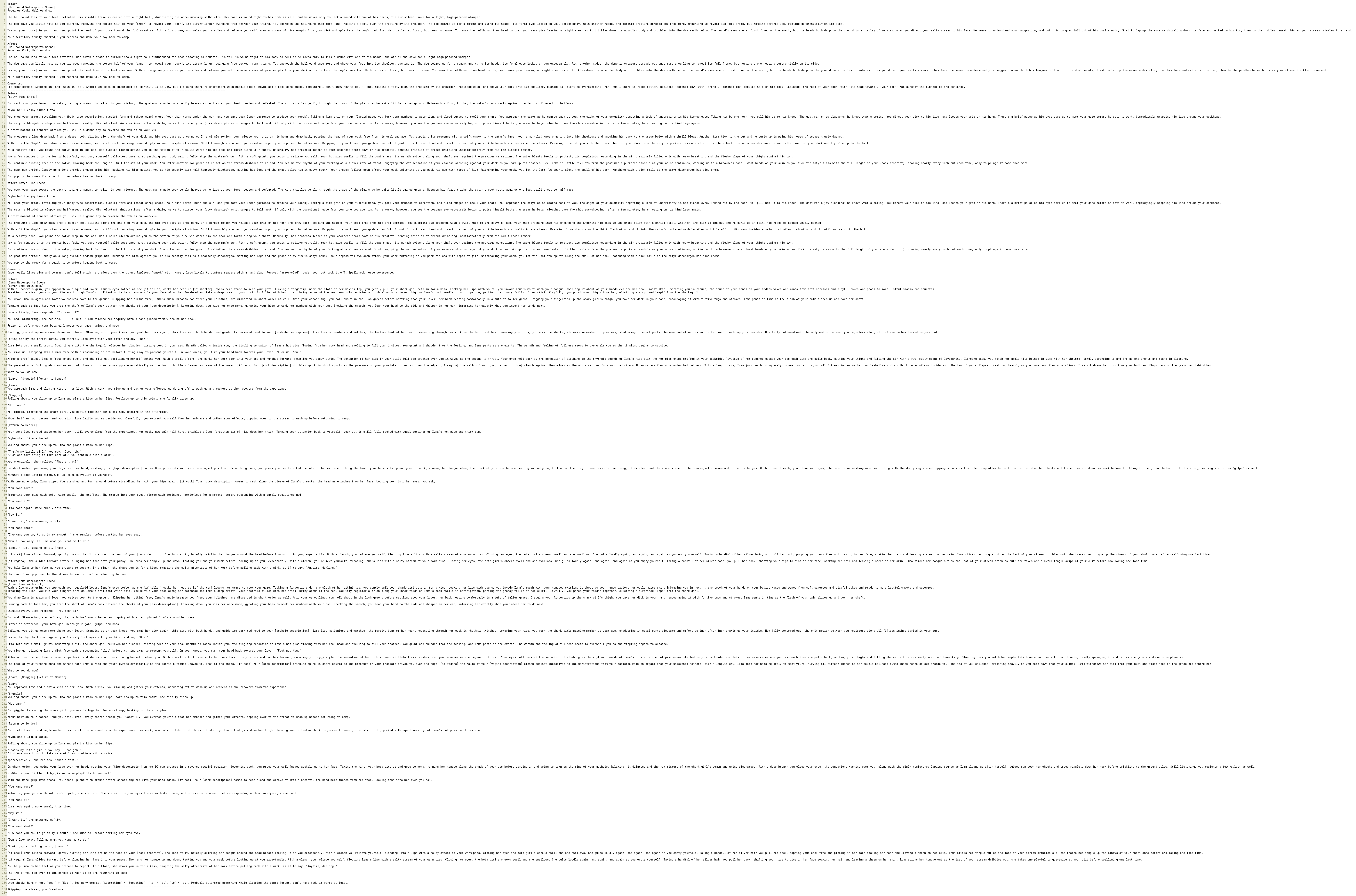 [if cock] Izma slides forward, gently pursing her lips around the head of your [cock descript]. She laps at it, briefly swirling her tongue around the head before looking up at you expectantly. With a clench you relieve yourself, flooding Izma's lips with a salty stream of your warm piss. Closing her eyes the beta girl's cheeks swell and she swallows. She gulps loudly again, and again, and again as you empty yourself. Taking a handful of her silver hair you pull her back, popping your cock free and pissing in her face soaking her hair and leaving a sheen on her skin. Izma sticks her tongue out as the last of your stream dribbles out; she traces her tongue up the sinews of your shaft once before swallowing one last time.