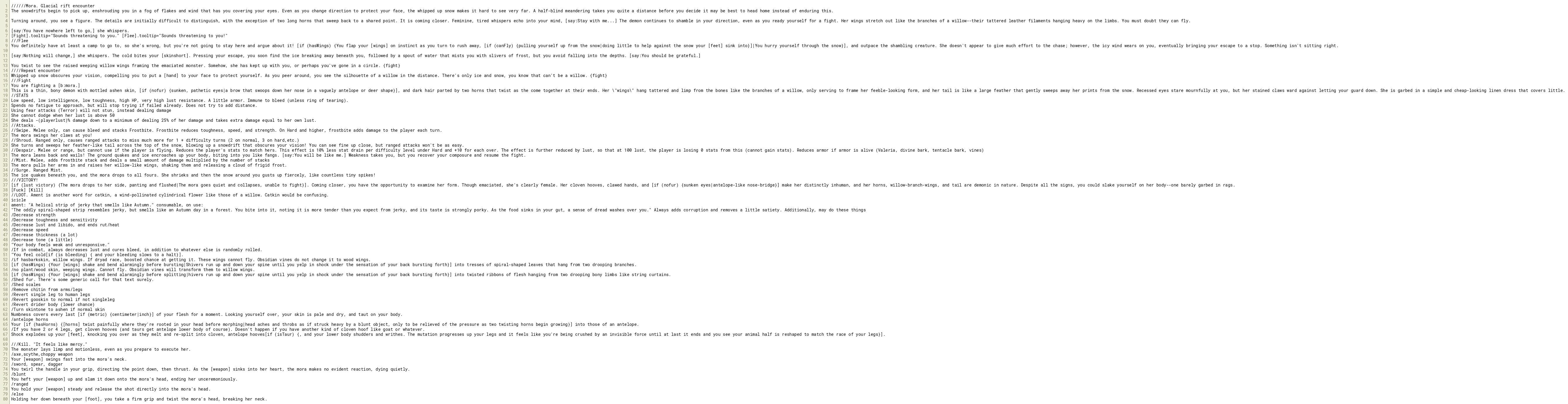 [if (lust victory) {The mora drops to her side, panting and flushed|The mora goes quiet and collapses, unable to fight}]. Coming closer, you have the opportunity to examine her form. Though emaciated, she's clearly female. Her cloven hooves, clawed hands, and [if (nofur) {sunken eyes|antelope-like nose-bridge}] make her distinctly inhuman, and her horns, willow-branch-wings, and tail are demonic in nature. Despite all the signs, you could slake yourself on her body--one barely garbed in rags.