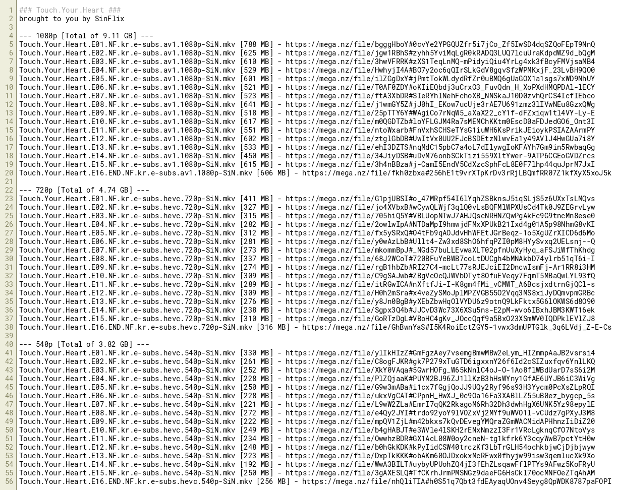 Touch.Your.Heart.E13.NF.kr.e-subs.av1.1080p-SiN.mkv [533 MB] - https://mega.nz/file/ehI3DZTS#nqMdC15pbC7a4oL7dIlywgIoKFAYh7Gm9in5RwbaqGg