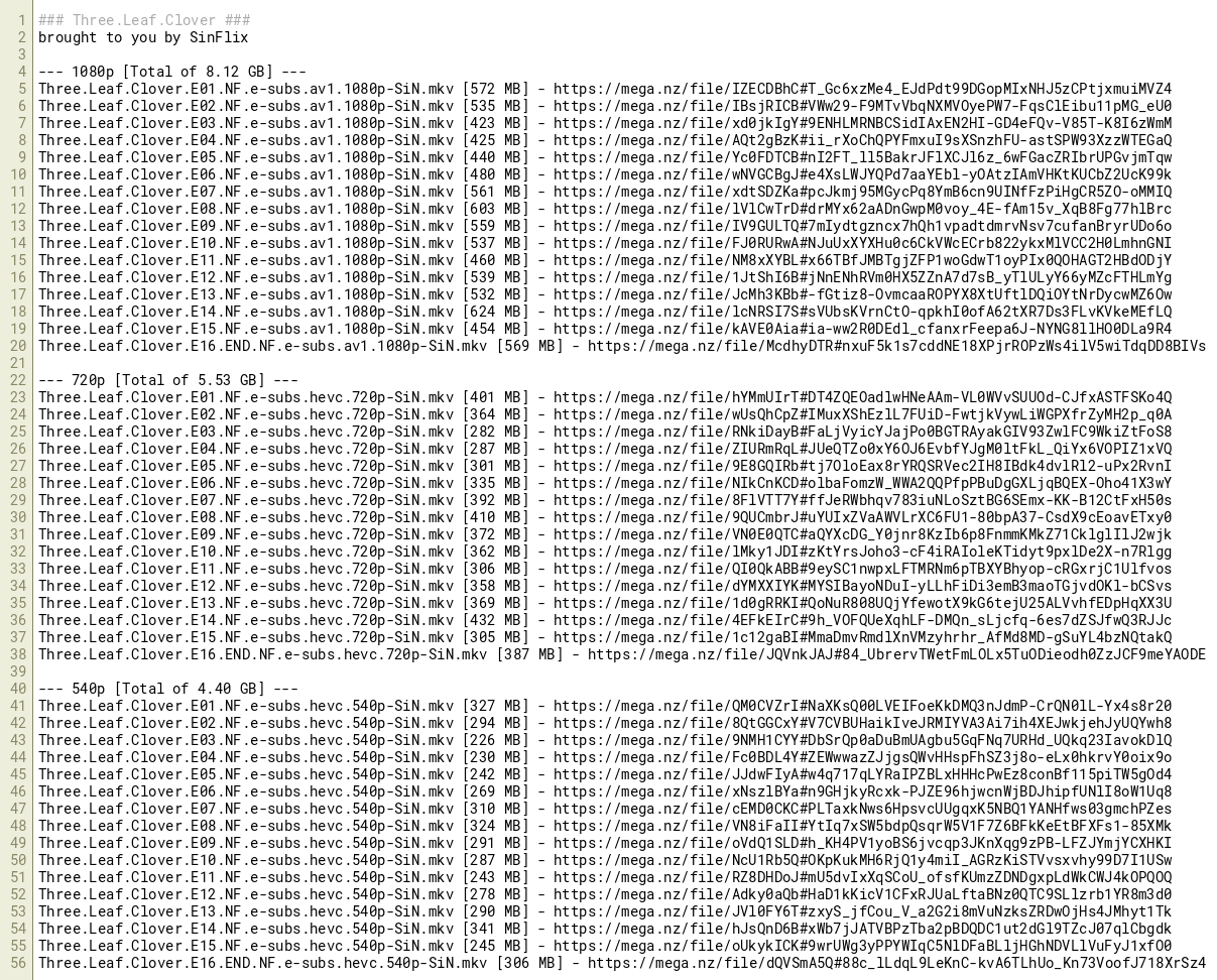 Three.Leaf.Clover.E01.NF.e-subs.hevc.540p-SiN.mkv [327 MB] - https://mega.nz/file/QM0CVZrI#NaXKsQ00LVEIFoeKkDMQ3nJdmP-CrQN0lL-Yx4s8r20
