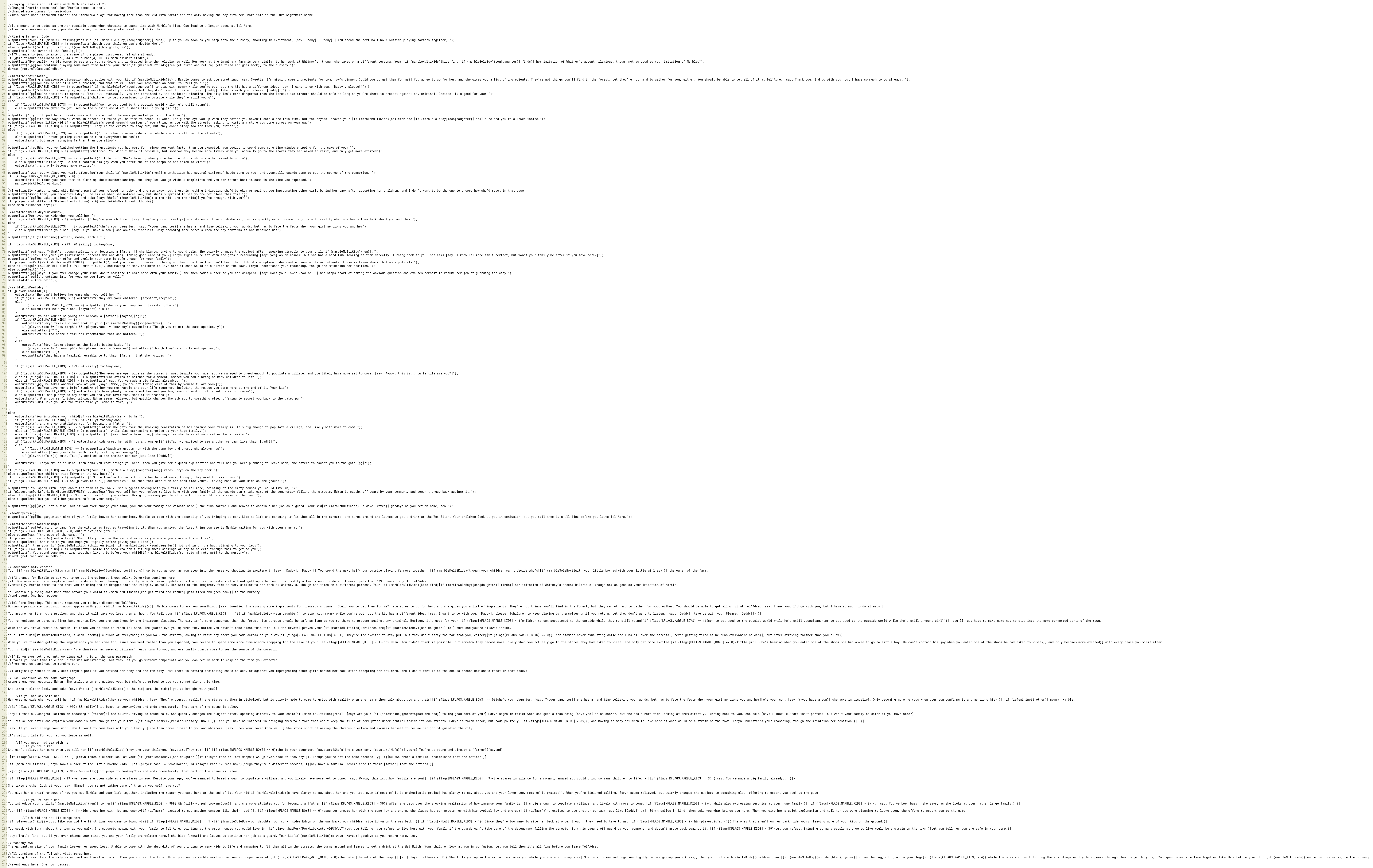 //[if (flags[KFLAGS.MARBLE_KIDS] > 999) && (silly)] it jumps to tooManyCows and ends prematurely. That part of the scene is below.