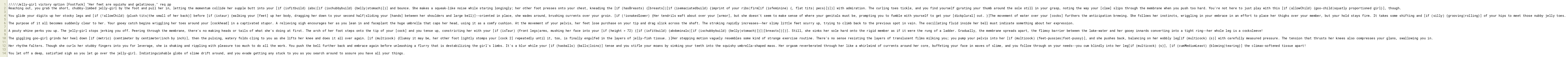 The giggling goo-girl grinds her heel down [if (metric) {centimeter by centimeter|inch by inch}], then the pulsing, watery folds cling to you as she lifts her knee and does it all over again. [if (multicock) {Clumsy it may be, her other foot lightly stomps your [cock 2] repeatedly until it, too, is finally engulfed in the layers of jelly-fish tissue. }]Her stepping motion vaguely resembles some kind of strange exercise routine. There's no sense resisting the layers of translucent films milking you; you pump your pelvis into her [if (multicock) {feet-pussies|foot-pussy}], and she pushes back, balancing on her wobbly leg[if (multicock) {s}] with carefully measured pressure. The tension that thrusts her knees also compresses your glans, swallowing you in.