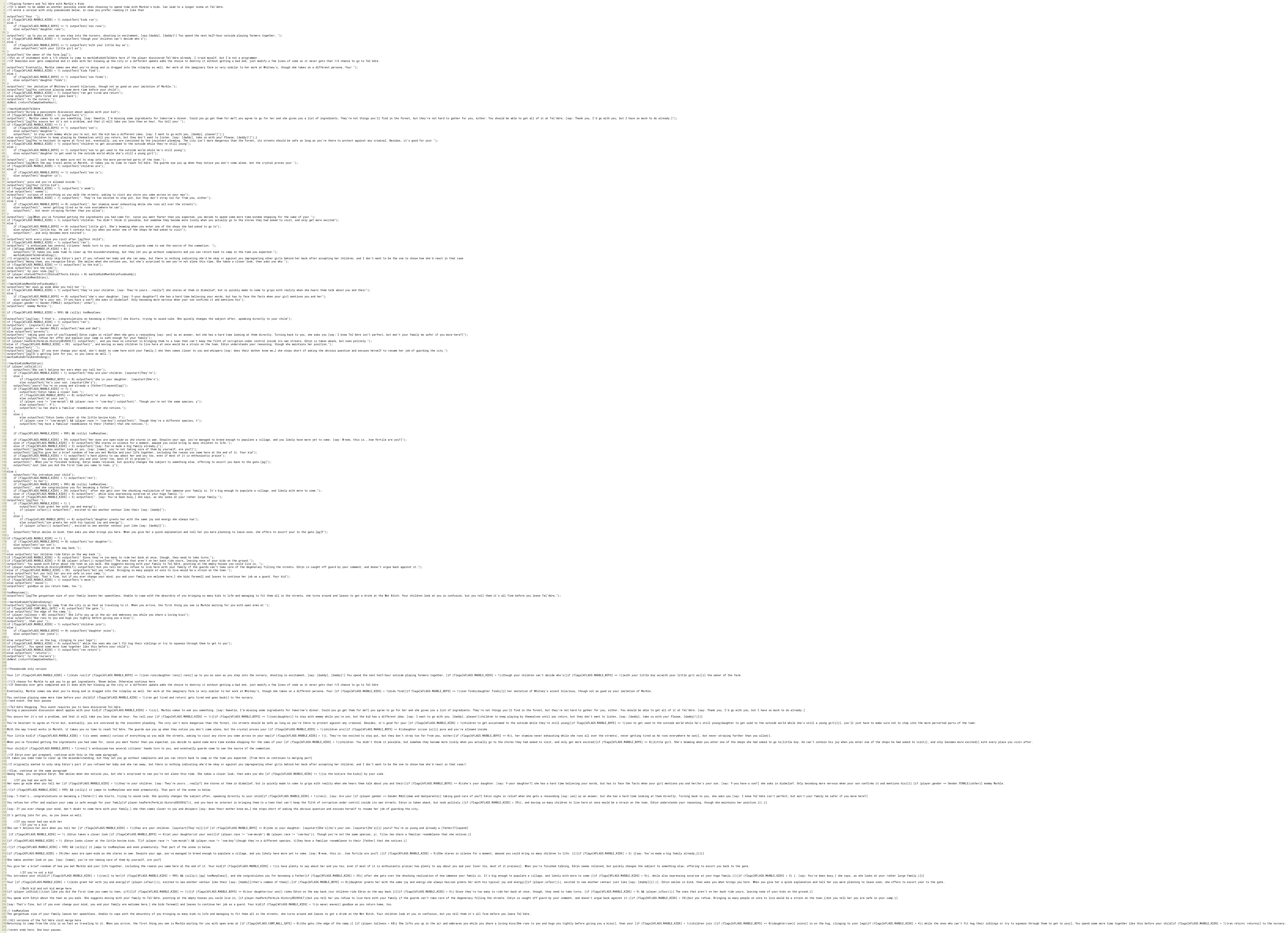 //[if (flags[KFLAGS.MARBLE_KIDS] > 999) && (silly)] it jumps to tooManyCows and ends prematurely. That part of the scene is below.