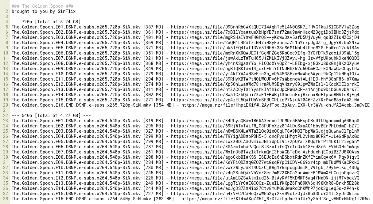 The.Golden.Spoon.E14.DSNP.e-subs.x264.540p-SiN.mkv [244 MB] - https://mega.nz/file/aoJgDS7Z#Mio27Ctv8muMG6UwaRdChKWhP7jok3gLeq5s-zP4h-k