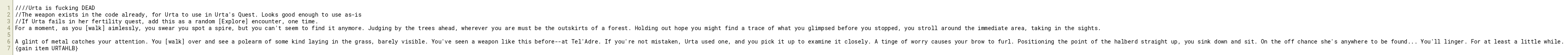 A glint of metal catches your attention. You [walk] over and see a polearm of some kind laying in the grass, barely visible. You've seen a weapon like this before--at Tel'Adre. If you're not mistaken, Urta used one, and you pick it up to examine it closely. A tinge of worry causes your brow to furl. Positioning the point of the halberd straight up, you sink down and sit. On the off chance she's anywhere to be found... You'll linger. For at least a little while.