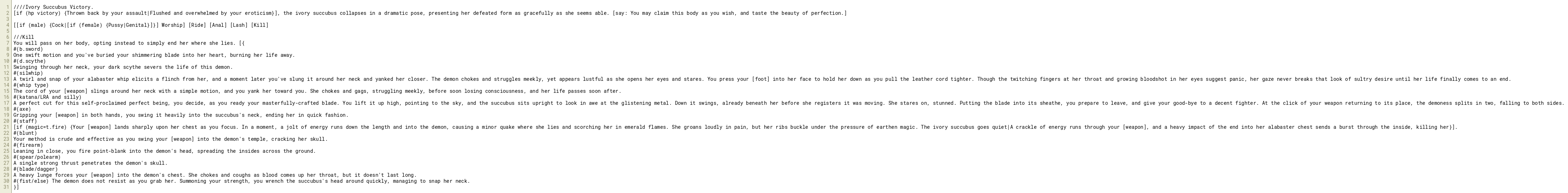[if (hp victory) {Thrown back by your assault|Flushed and overwhelmed by your eroticism}], the ivory succubus collapses in a dramatic pose, presenting her defeated form as gracefully as she seems able. [say: You may claim this body as you wish, and taste the beauty of perfection.]