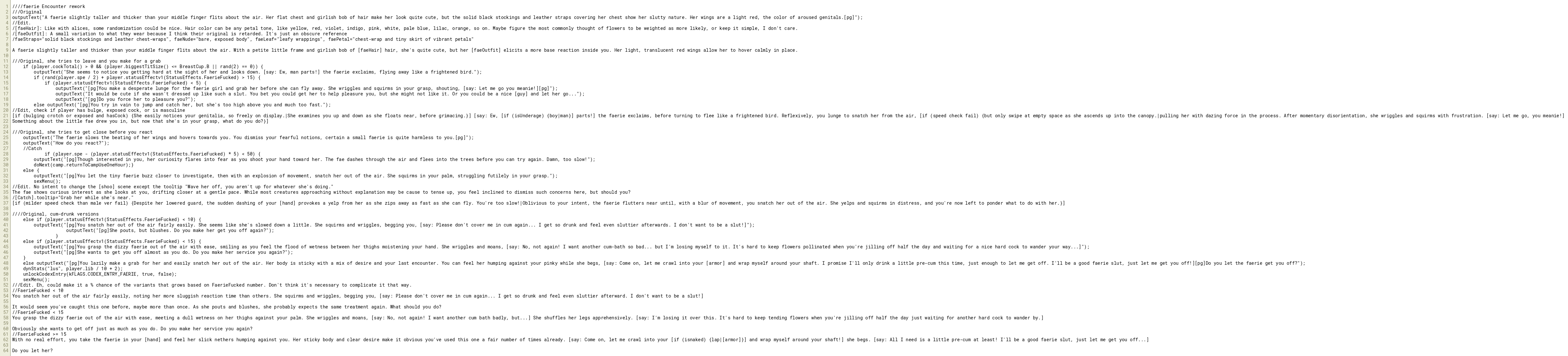[if (bulging crotch or exposed and hasCock) {She easily notices your genitalia, so freely on display.|She examines you up and down as she floats near, before grimacing.}] [say: Ew, [if (isUnderage) {boy|man}] parts!] the faerie exclaims, before turning to flee like a frightened bird. Reflexively, you lunge to snatch her from the air, [if (speed check fail) {but only swipe at empty space as she ascends up into the canopy.|pulling her with dazing force in the process. After momentary disorientation, she wriggles and squirms with frustration. [say: Let me go, you meanie!]