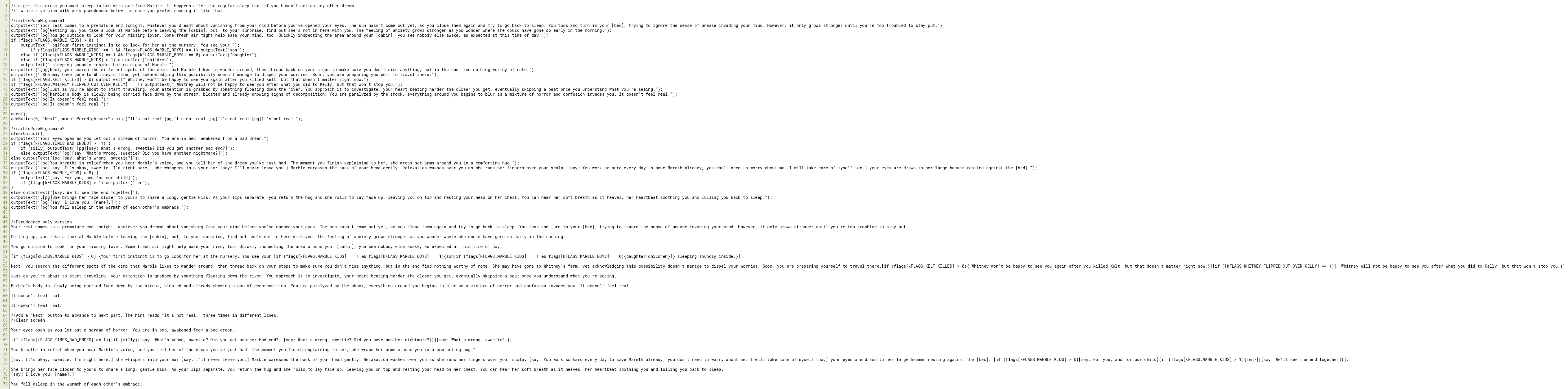 [if (flags[kFLAGS.MARBLE_KIDS] > 0) {Your first instinct is to go look for her at the nursery. You see your [if (flags[kFLAGS.MARBLE_KIDS] == 1 && flags[kFLAGS.MARBLE_BOYS] == 1){son|if (flags[kFLAGS.MARBLE_KIDS] == 1 && flags[kFLAGS.MARBLE_BOYS] == 0){daughter|children}]} sleeping soundly inside.}]