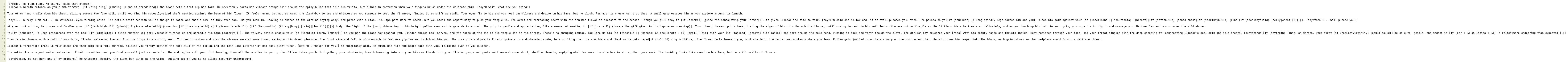 Iliador's breath catches as you climb forward, [if (singleleg) {ramping up one of|straddling}] the broad petals that cup his form. He sheepishly parts his vibrant orange hair around the spiny bulbs that hold his fruits, but blinks in confusion when your fingers brush under his delicate chin. [say:W-wait, what are you doing?]