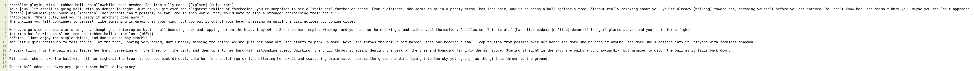 Her eyes go wide and she starts to gasp, though gets interrupted by the ball bouncing back and tapping her on the head. [say:AH--] She rubs her temple, wincing, and you see her horns, wings, and tail unveil themselves. An illusion! This is a[if (has alice codex) {n Alice| demon}]! The girl glares at you and you're in for a fight!
