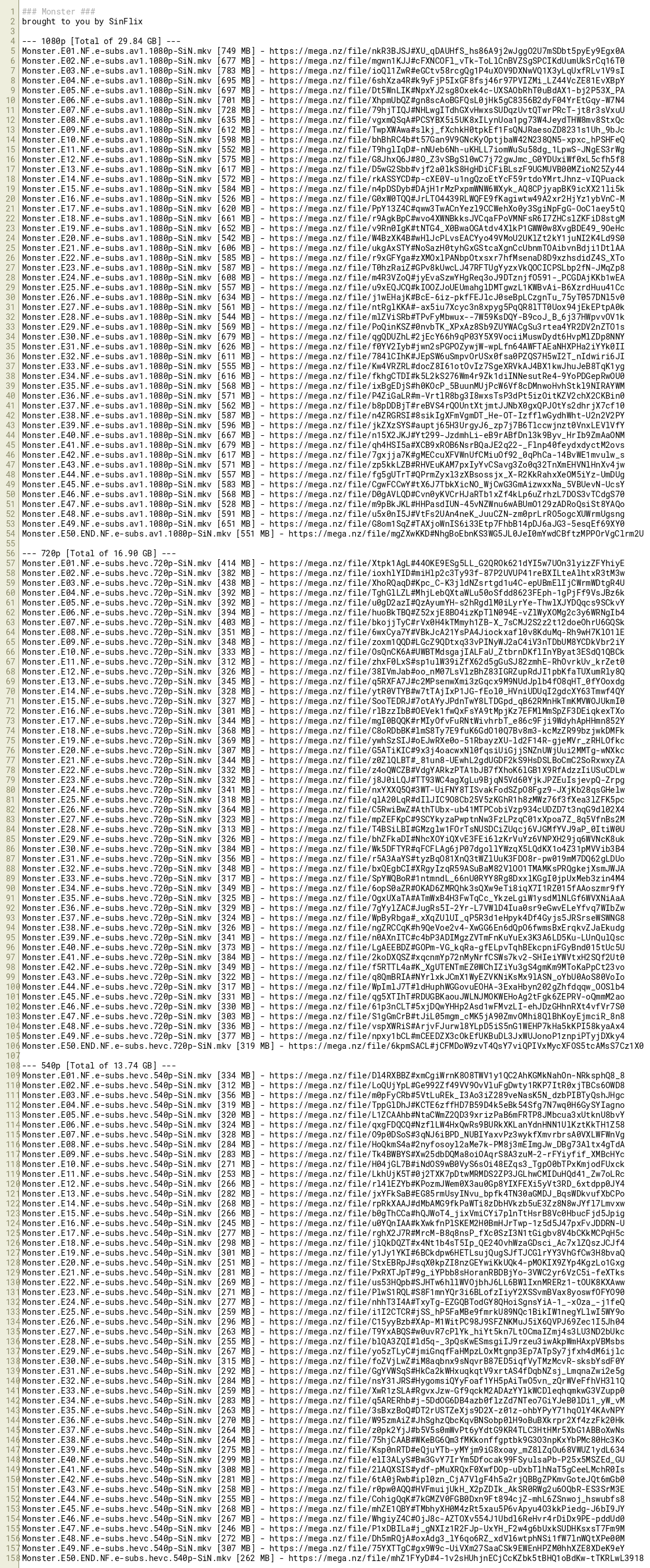 Monster.E48.NF.e-subs.av1.1080p-SiN.mkv [591 MB] - https://mega.nz/file/u5x0nI5J#VtFs2UAn4neK_JuuCZN-zm0prLrRO5ogcXUWrmUgsng