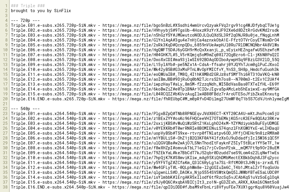 Triple.E01.e-subs.x264.540p-SiN.mkv - https://mega.nz/file/PlgxBZpQ#TNb8RPNGEqvJVdX0ECT-KYT20CA4U-mKtJhsPccm5jU