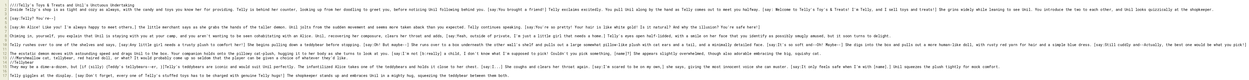 Inside Telly's shop is as tight and cozy as always, with the candy and toys you know her for providing. Telly is behind her counter, looking up from her doodling to greet you, before noticing Unil following behind you. [say:You brought a friend!] Telly exclaims excitedly. You pull Unil along by the hand as Telly comes out to meet you halfway. [say: Welcome to Telly's Toy's & Treats! I'm Telly, and I sell toys and treats!] She grins widely while leaning to see Unil. You introduce the two to each other, and Unil looks quizzically at the shopkeeper.