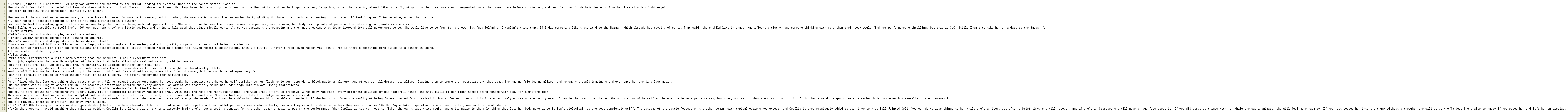 Her need to feel the wanting gaze of others means anything that has her being watched appeals to her. She would love to have the player request she perform, even showing her body, with plenty of prose on the detailing and joints as she strips.