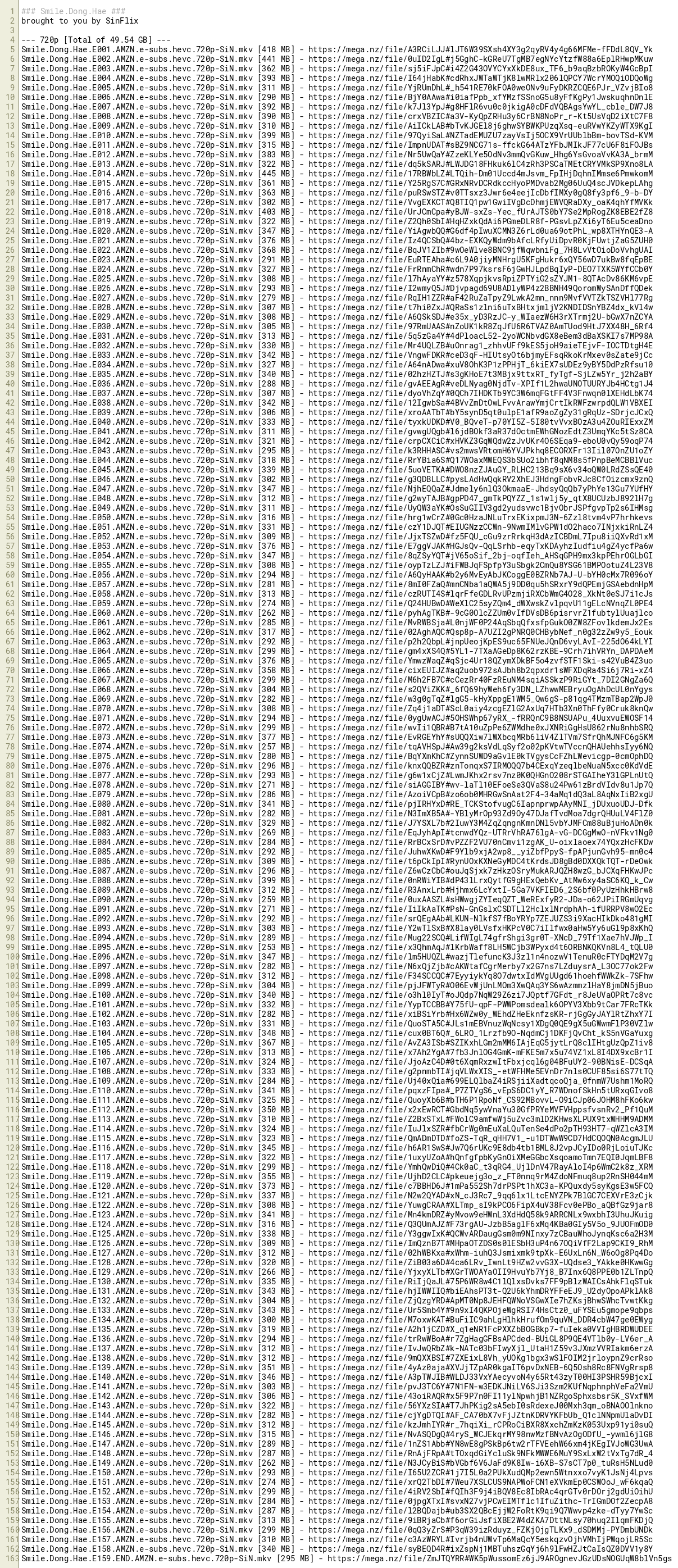 Smile.Dong.Hae.E151.AMZN.e-subs.hevc.720p-SiN.mkv [274 MB] - https://mega.nz/file/xrQ2TbDI#7Weu7XSLCUS9NAPWoFCN1eXVkmEp0CSWOoJ_wF6kqaQ