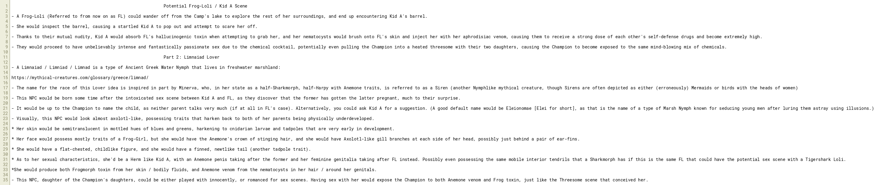 * As to her sexual characteristics, she'd be a Herm like Kid A, with an Anemone penis taking after the former and her feminine genitalia taking after FL instead. Possibly even possessing the same mobile interior tendrils that a Sharkmorph has if this is the same FL that could have the potential sex scene with a Tigershark Loli.