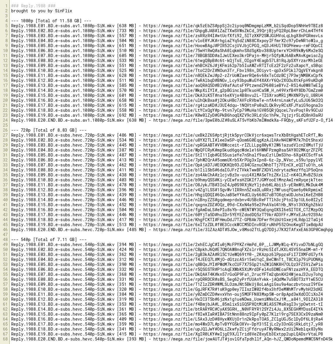 Reply.1988.E18.BD.e-subs.av1.1080p-SiN.mkv [558 MB] - https://mega.nz/file/LtYCxQgY#p-9tvn7yCp79MuHa1GV05QRjQqceL7svPoq1Rv9GCuU