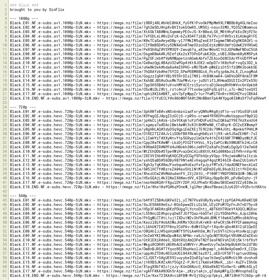 Black.E01.NF.e-subs.hevc.540p-SiN.mkv - https://mega.nz/file/b4YXTZ5B#uGKPe32j_yI7N7Psa9URyXyx4afjzpYGAP4uKReKCQ8