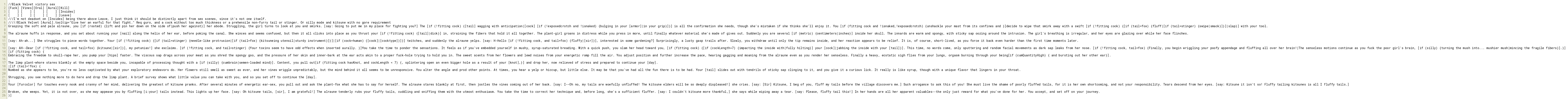 [say: AH--Dear [if (!fitting cock, and tail=fox) {kitsune|[sir]}], my petunias!] she exclaims. [if (!fitting cock, and tail=stinger) {Your toxins seem to have odd effects when inserted aurally. }]You take the time to ponder the sensations. It feels as if you've embedded yourself in mushy, syrup-saturated breading. With a quick push, you slam her head toward you, [if (fitting cock) {[if (cockLength>7) {impacting the inside with|fully hilting}] your [cock]|jabbing the inside with your [tail]}]. This time, no words come, only sputtering and random facial movements as dark sap leaks from her nose. [if (!fitting cock, tail=fox) {Finally, you begin wriggling your poofy appendage and fluffing all over her brain!|The senseless motions continue as you fuck the poor girl's brain, [if (silly) {turning the mush into... mushier mush|mincing the fragile fibers}].}]
