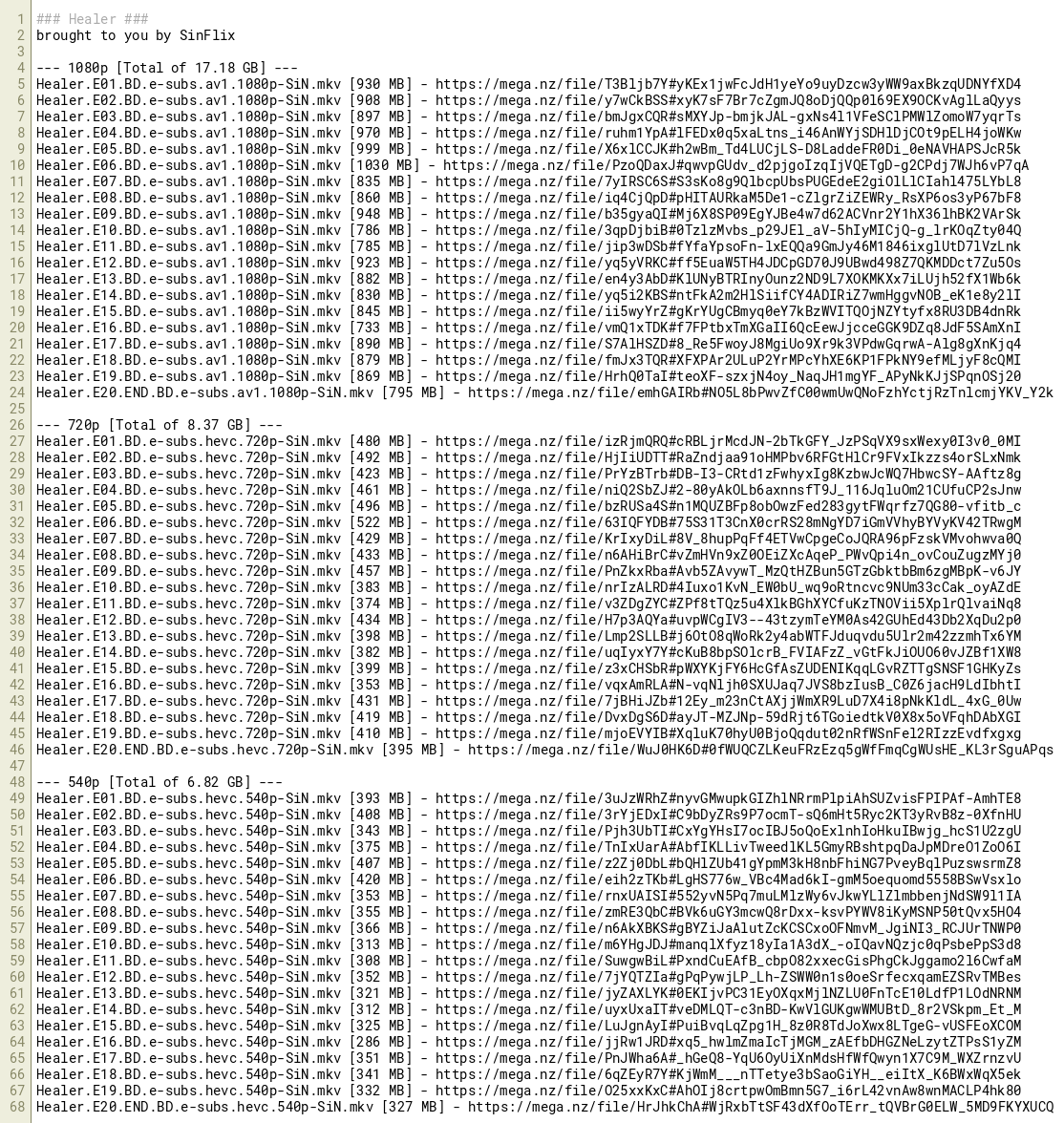 Healer.E14.BD.e-subs.av1.1080p-SiN.mkv [830 MB] - https://mega.nz/file/yq5i2KBS#ntFkA2m2HlSiifCY4ADIRiZ7wmHggvNOB_eK1e8y2lI