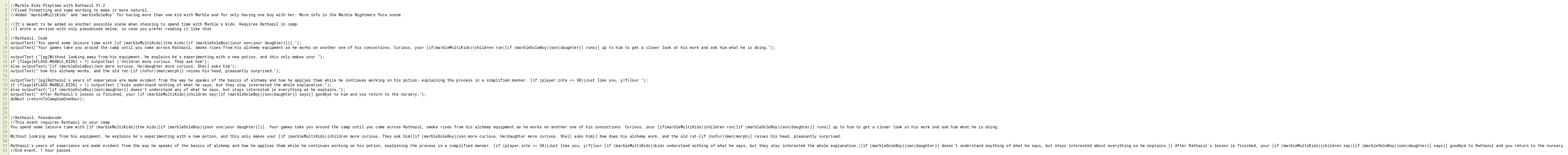outputText("Your games take you around the camp until you come across Rathazul, smoke rises from his alchemy equipment as he works on another one of his concoctions. Curious, your [if(marbleMultiKids){children run|[if (marbleSoleBoy){son|daughter}] runs}] up to him to get a closer look at his work and ask him what he is doing.");