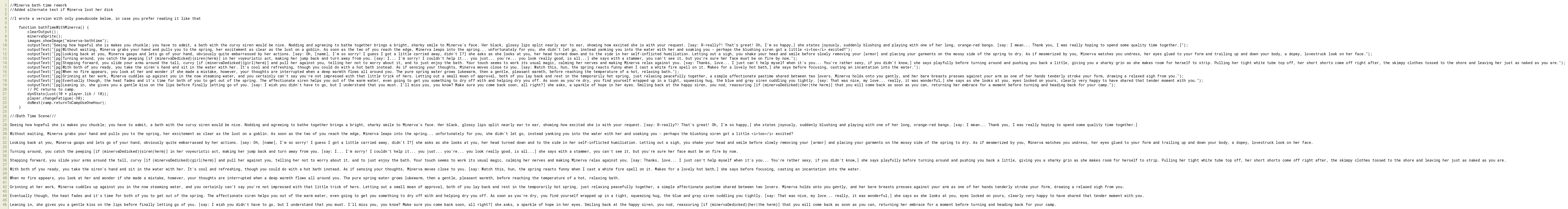 outputText("[pg]Grinning at her work, Minerva cuddles up against you in the now steaming water, and you certainly can't say you're not impressed with that little trick of hers. Letting out a small moan of approval, both of you lay back and rest in the temporarily hot spring, just relaxing peacefully together, a simple affectionate pastime shared between two lovers. Minerva holds onto you gently, and her bare breasts presses against your arm as one of her hands tenderly stroke your form, drawing a relaxed sigh from you.");