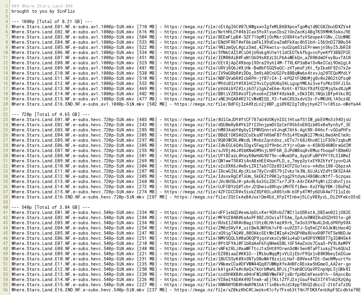 Where.Stars.Land.E01.NF.e-subs.hevc.540p-SiN.mkv [334 MB] - https://mega.nz/file/dFFlxbQI#exmJpGLvXer9Q9vbZ7WI1lsQSRxtA_DBIwn02ljO82E