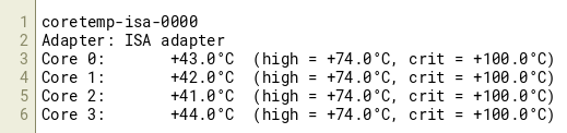 Core 0: +43.0°C (high = +74.0°C, crit = +100.0°C)