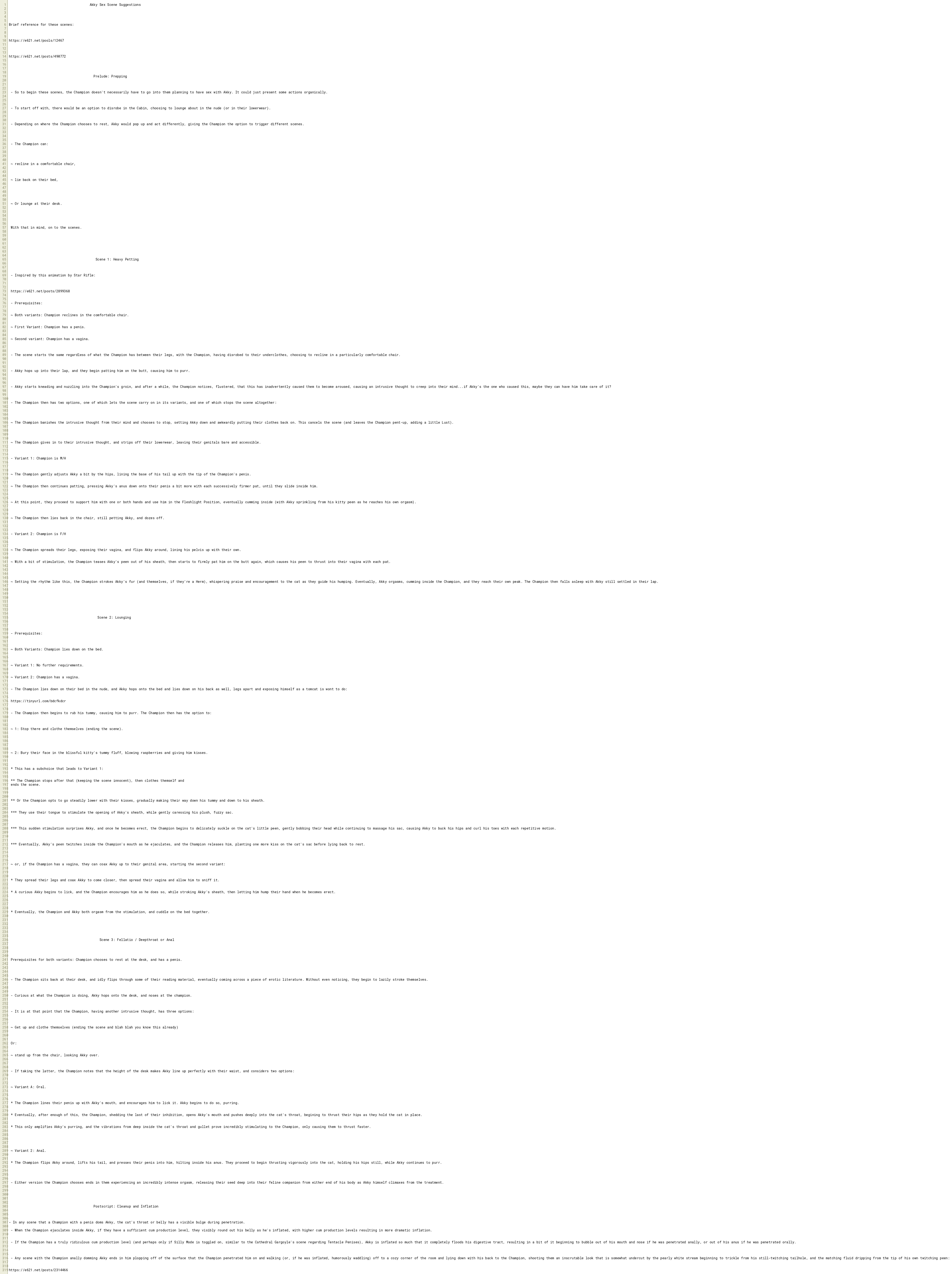 - Any scene with the Champion anally domming Akky ends in him plopping off of the surface that the Champion penetrated him on and walking (or, if he was inflated, humorously waddling) off to a cozy corner of the room and lying down with his back to the Champion, shooting them an inscrutable look that is somewhat undercut by the pearly white stream beginning to trickle from his still-twitching tailhole, and the matching fluid dripping from the tip of his own twitching peen: