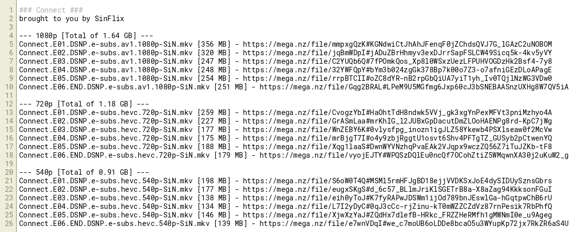 Connect.E01.DSNP.e-subs.hevc.540p-SiN.mkv [198 MB] - https://mega.nz/file/S6oW0T4Q#MSMl5rmHFJgBD18ejjVVDKSxJoE4dySIDUySznsGbrs