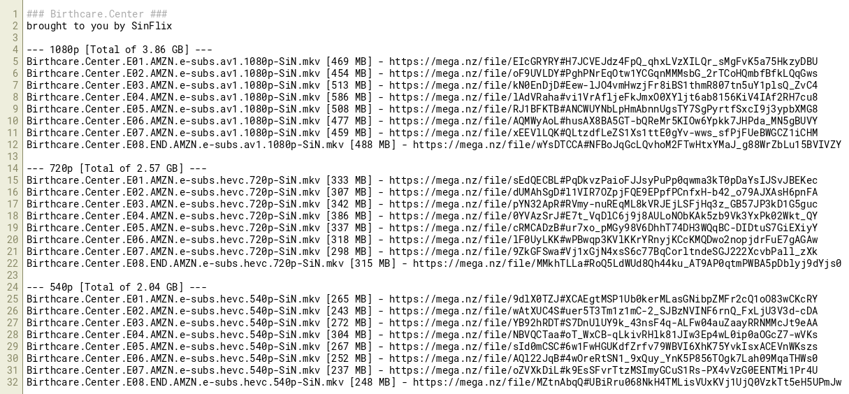 Birthcare.Center.E01.AMZN.e-subs.av1.1080p-SiN.mkv [469 MB] - https://mega.nz/file/EIcGRYRY#H7JCVEJdz4FpQ_qhxLVzXILQr_sMgFvK5a75HkzyDBU