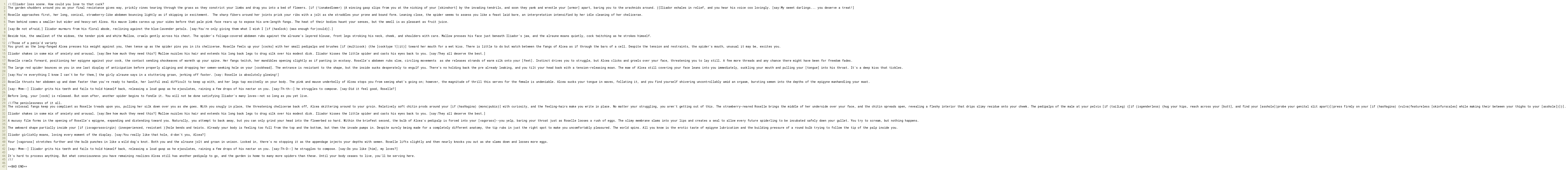 [say: Mnm--] Iliador grits his teeth and fails to hold himself back, releasing a loud gasp as he ejaculates, raining a few drops of his nectar on you. [say:Th-th--] he struggles to compose. [say:Did it feel good, Roselle?]