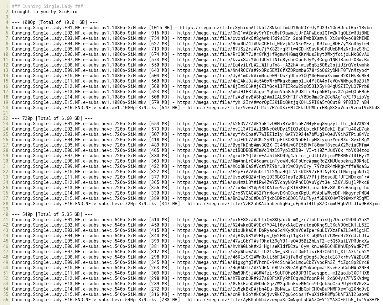 Cunning.Single.Lady.E15.NF.e-subs.hevc.540p-SiN.mkv [316 MB] - https://mega.nz/file/cnR1kSoY#kCp6jvvRkC7gu6oibs1fvuXitRK8Wp5kAF3Al26aow0