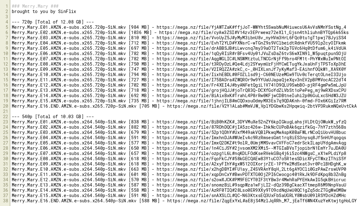Merry.Mary.E12.AMZN.e-subs.x264.540p-SiN.mkv [570 MB] - https://mega.nz/file/s2owXJCK#PM9FECYT0IF3tYBw3r4MwhRaPYEHkAwIG5qkBHicruc