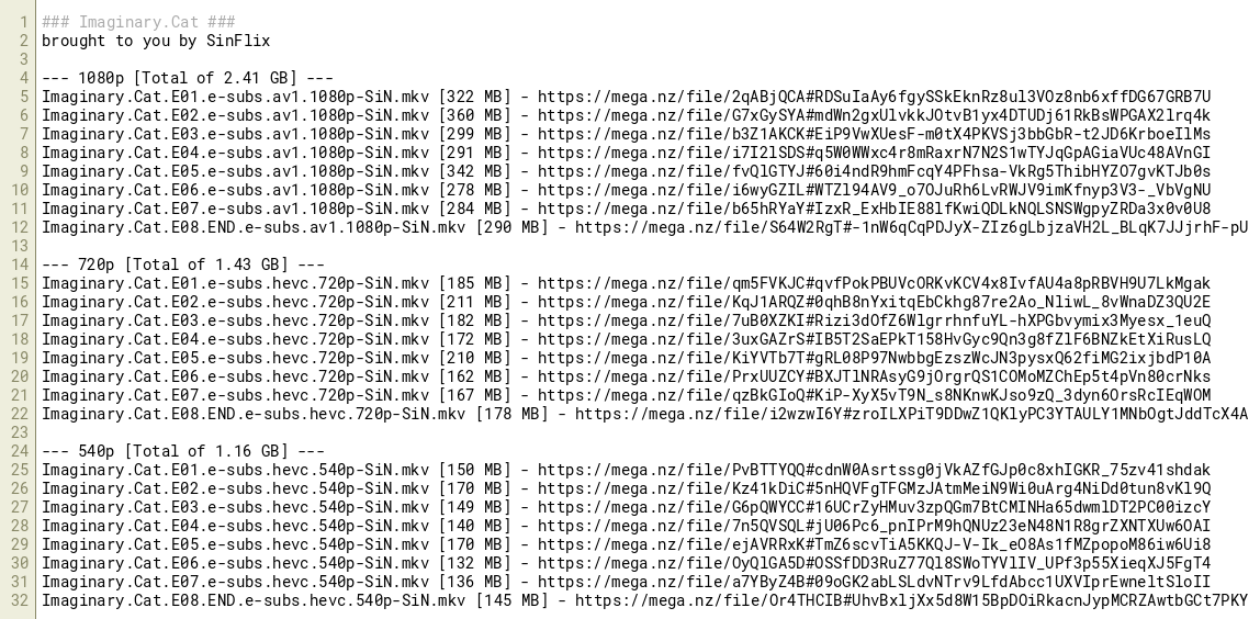 Imaginary.Cat.E08.END.e-subs.hevc.720p-SiN.mkv [178 MB] - https://mega.nz/file/i2wzwI6Y#zroILXPiT9DDwZ1QKlyPC3YTAULY1MNbOgtJddTcX4A