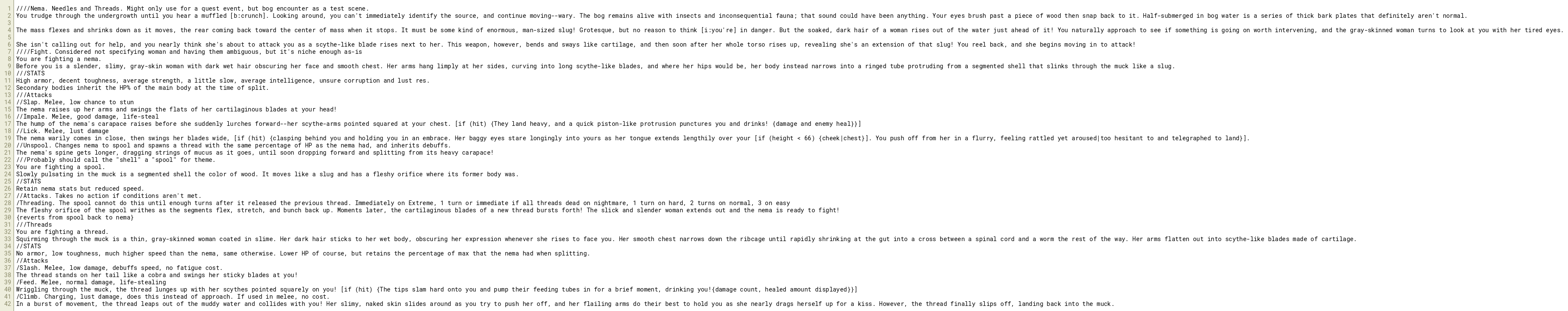 ////Nema. Needles and Threads. Might only use for a quest event, but bog encounter as a test scene.